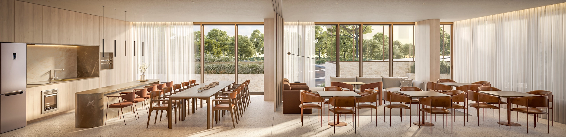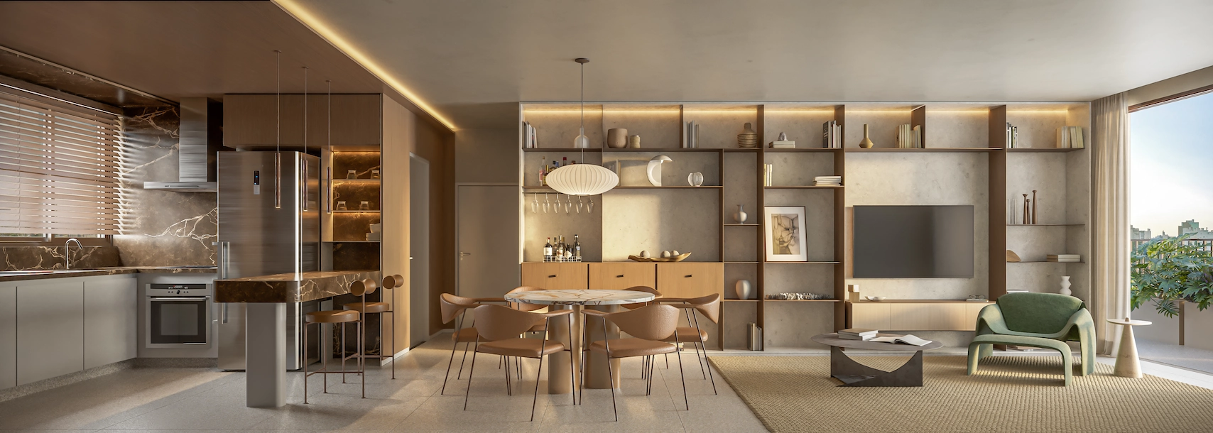 os interiores acolhem e integram as áreas e promovem espaços mais fluidos, orgânicos e convidativos.
