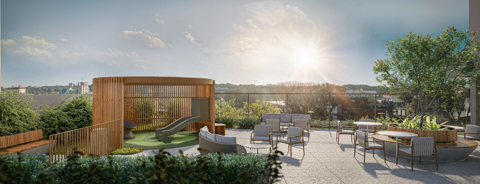 Espaços restauradores que convidam ao relaxamento e à contemplação (praça, piscina, terraços)