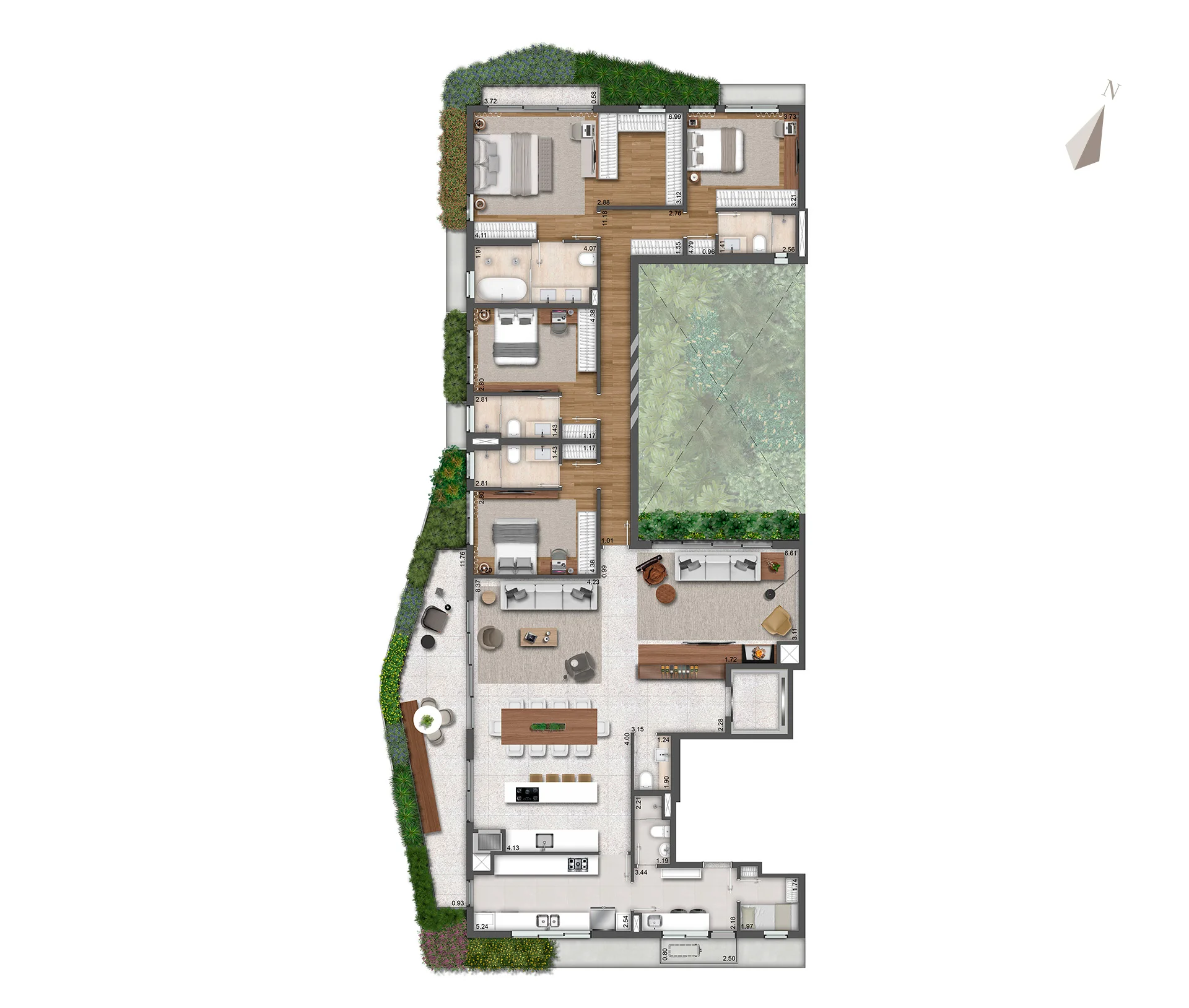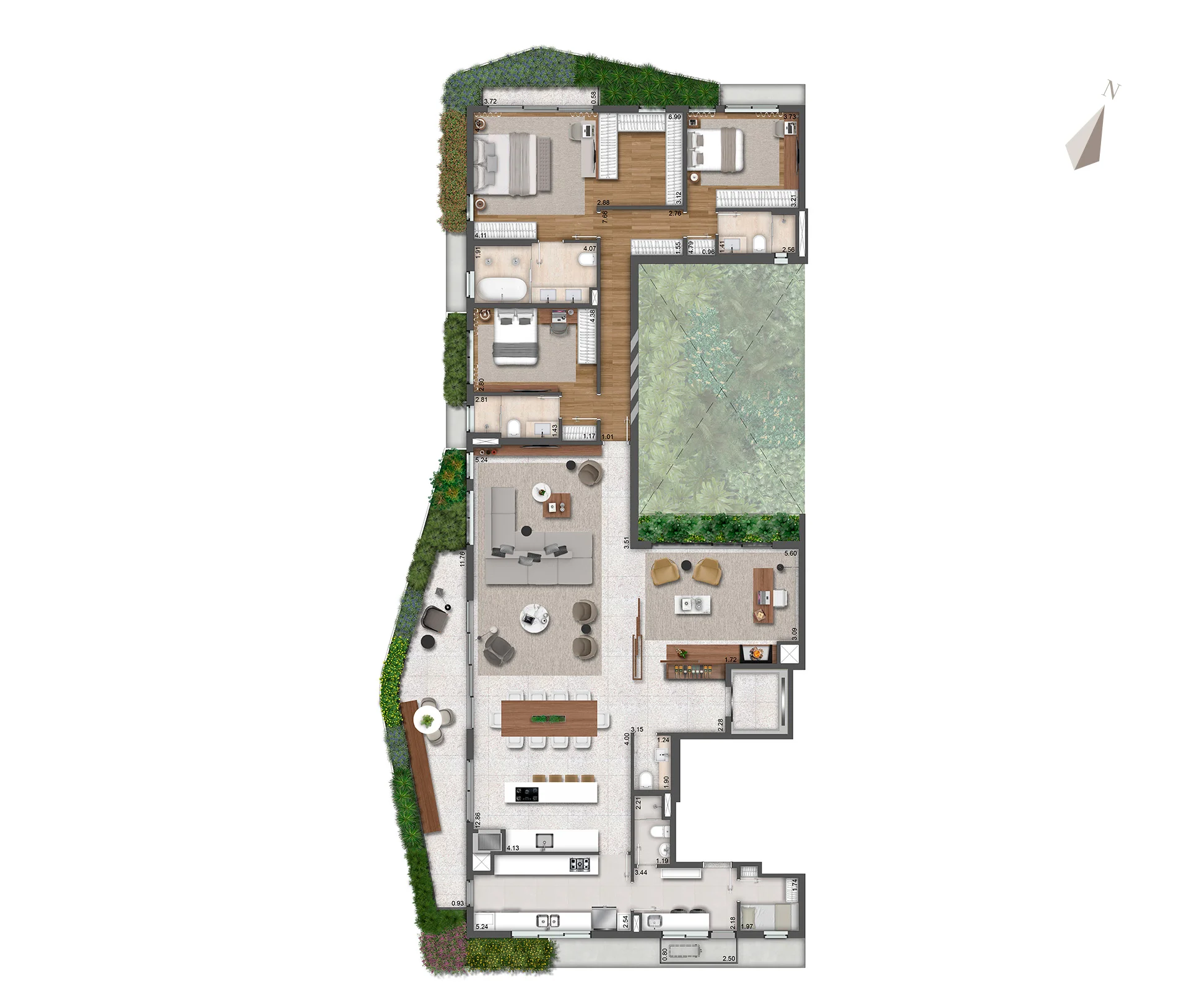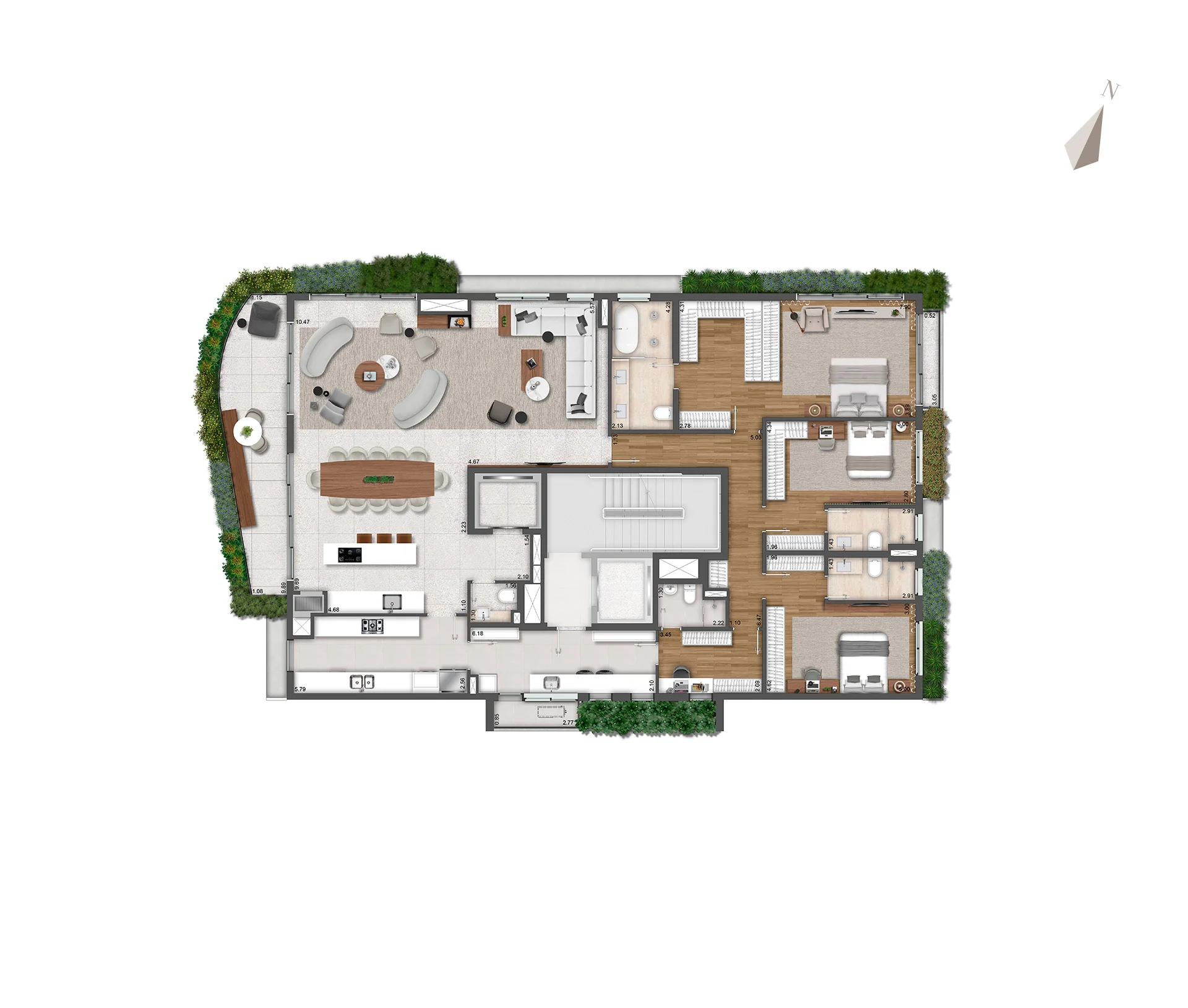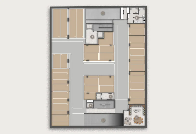 No átrio, onde a sintonia entre luz e sombra encanta, relembramos o berço da arquitetura e criamos uma ponte para o presente.